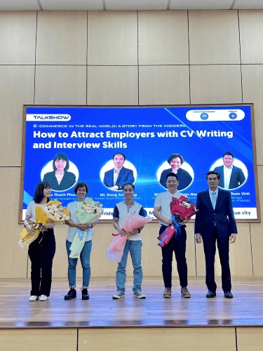 Cơn mưa xuân đặc trưng của xứ Huế cũng không thể nào đánh bay sự nhiệt huyết của gần 300 bạn sinh viên đến với buổi Talkshow "Bí quyết thu hút nhà tuyển dụng với kỹ năng làm CV và phỏng vấn" được tổ chức vào sáng 15/3, với sự chia sẻ bởi quý anh/chị diễn giả là những chuyên gia hàng đầu về Thương mại điện tử tại Việt Nam: Anh Đặng Anh Dũng (cựu phó tổng, giám đốc tài chính tại Lazada, cựu giám đốc tài chính mảng finance excellence tại Unilever Việt Nam), Anh Nguyễn Tuấn Vinh (cựu quản lý nhân sự tại Lazada, phát triển nhân lực Onpoint, training lead VinID), Chị Nguyễn Thuận Hòa (cựu quản lý ngành hàng FMCG tại Lazada), và Chị Trần Thanh Phương (cựu quản lý cấp cao phát triển người dùng và quản lý khuyến mãi tại Lazada).